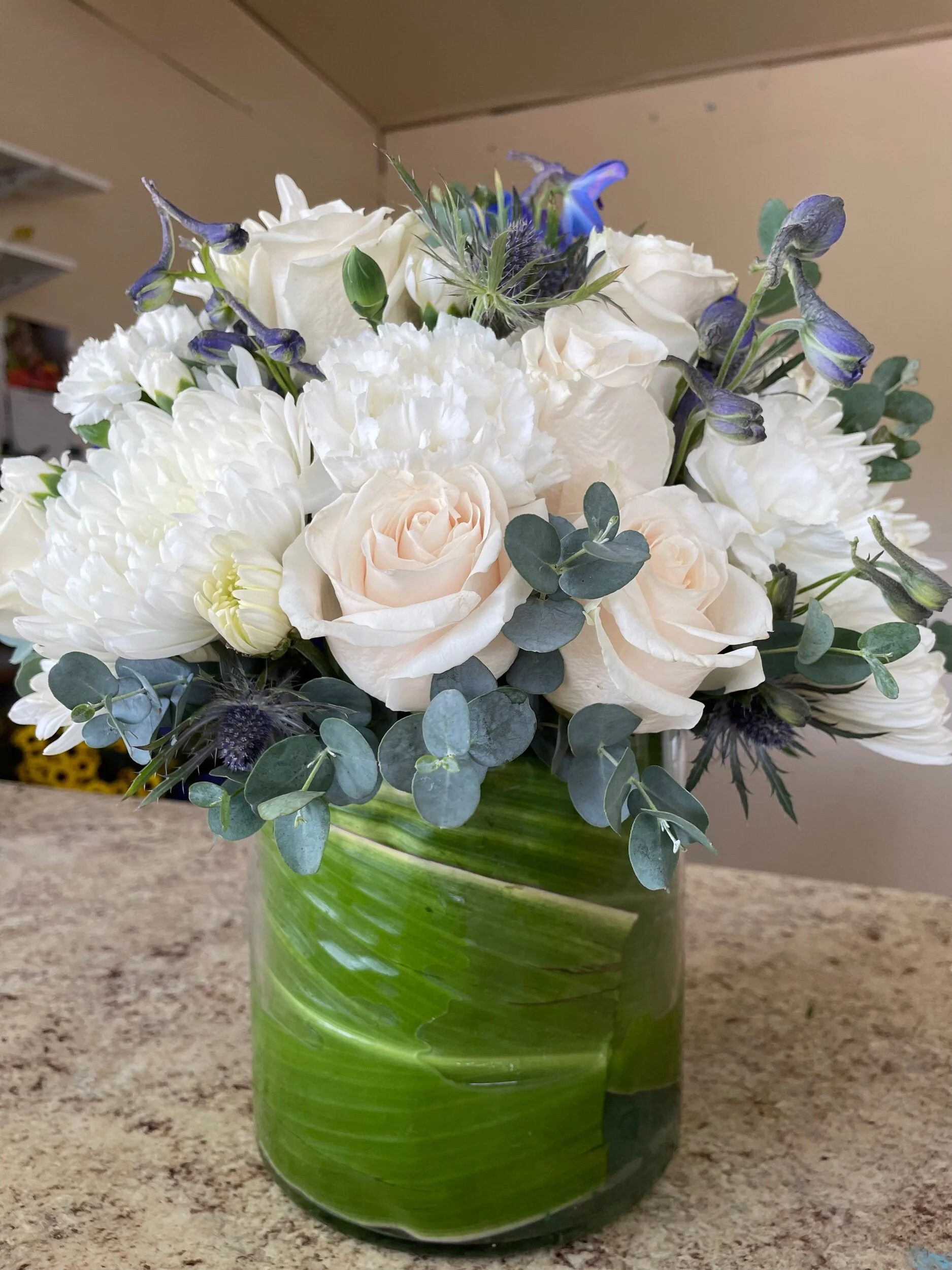 Arrangement measures approximately 24"H x 32”L without measuring easel stand.